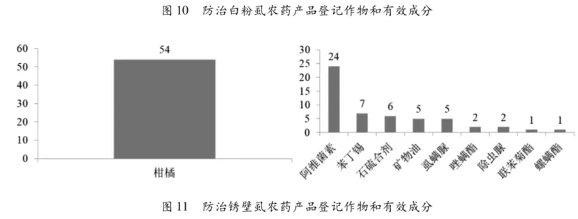 10. 锈壁虱 防治锈壁虱农药登记产品54个,登记作物仅有柑橘1 种作物,有效成分包括阿维菌素、苯丁锡、石硫合剂、矿物油、虱螨脲、唑螨酯、除虫脲、联苯菊酯、螺螨酯等。