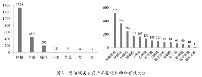 2. 螨类 防治螨类农药登记产品1930个,登记作物有柑橘、苹果、棉花、小麦、草莓、梨、枣、辣椒、茄子等作物,有效成分包括阿维菌素、哒螨灵、炔螨特、螺螨酯、乙螨唑、四螨嗪、联苯肼酯等。