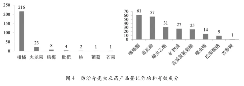 3. 介壳虫 防治介壳虫农药登记产品276个,登记作物有柑橘、火龙果、杨梅、枇杷、桃、葡萄、芒果等作物,有效成分包括噻嗪酮、毒死蜱、螺虫乙酯、矿物油、高效氯氰菊酯、噻虫嗪、松酯酸钠、苦参碱等。