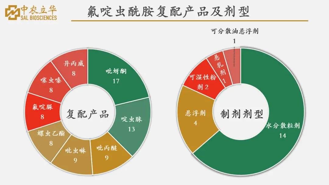 单剂主要有 10%、20%、50%、60%氟啶虫酰胺水分散粒剂,二元复配主要和阿维、氟啶脲、吡虫啉、啶虫脒、吡蚜酮、异丙威等复配,主要剂型有35%、46%、50%氟啶·啶虫脒水分散粒剂、40%、50%氟啶·吡蚜酮水分散粒剂、24%阿维.氟啶悬浮剂及53%氟啶·异丙威可湿性粉剂等。主要应用作物:豆类、甘蓝、芹菜、谷物、柑橘、棉花、葫芦、果菜、温室观赏植物、啤酒花、园艺作物、莴苣、西瓜、芥菜、仁果、马铃薯、菠菜、核果、向日葵、茶树和番茄等。主要防治靶标为:棉蚜、马铃薯、粉虱、车前圆尾蚜、假眼小绿叶蝉、桃蚜、褐飞虱、小黄蓟马、麦长管蚜、蓟马、温室粉虱等。啶虫酰胺之所以未来大有作为,主要有以下方面因素决定:1,作用机理独特:蚜虫在危害作物的时候要在叶片上的吸汁来危害作物,氟啶虫酰胺可以迅速阻止其吸汁。与其他杀虫剂无交互抗性。2,低剂量,高活性,高渗透性,内吸传导性强,耐雨水冲刷,持效期长。3,对环境友好,对蜜蜂安全,符合全球市场减少植保产品影响生态系统安全的预期。二,市场操作的前瞻性与差异化竞品定位,以及国内制剂企业对此品种关注度明显提升,预登记证件增多,共同推广,实践的深入,会助推氟啶虫酰胺市场开发的进程。三,随着合成工艺的完善,氟啶虫酰胺的专利到期,国内仿制企业大批涌现,拉低整体氟啶虫酰胺制剂价格;可以利用各国对于新烟碱类产品禁限用的时机,抢占现有的传统新烟碱类杀虫剂市场。氟啶虫酰胺对幼虫和成虫都具有杀虫活性,以独特的作用机理、极高的生物活性以及对蚜虫的优异防效使其成为市场竞争的焦点,加之不伤蜜蜂的特性也会在未来市场中逐渐替代新烟碱类、氟啶虫胺腈及氟吡呋喃酮的市场份额,减少植物保护产品对传粉媒介和生态系统的影响,全球市场前景值得期待。