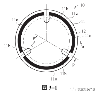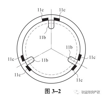 由于图 3-2中注入部件 11c 和支承部件 11b 在圆周方向上的尺寸非常接近,从图 3-2中并不能毫无疑义地确定“在圆周方向上,注入部件 11c 的尺寸大于支承部件 11b 的尺寸”,因此,技术特征“注入部件在圆周方向上延伸的距离比透镜支承部件圆周方向上的宽度大”不属于图 3-2公开的内容。