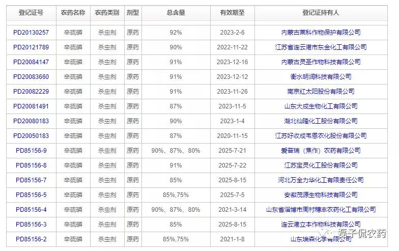 国内目前有辛硫磷原药登记15个。单制剂 226个,主要的剂型为 40%、45%、50%乳油,15%、20%、40%高渗乳油,35%胶囊剂,35%微粒胶囊剂,3%水乳种衣剂,1.5%、3%颗粒剂,2.5%微粒剂。