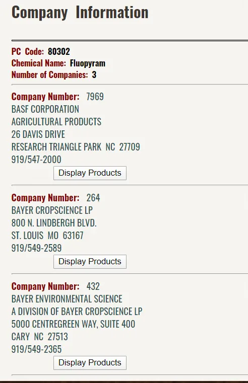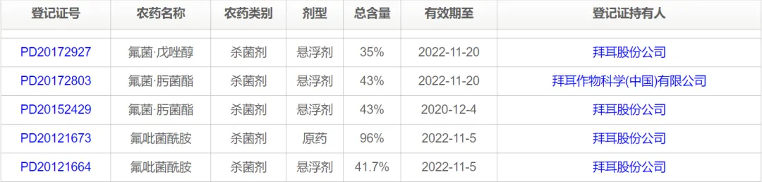 德国拜耳作物科学公司的氟吡菌酰胺在2012年上市,迄今,已在全球包括中国、美国、欧盟(23国)、澳大利亚、罗马尼亚、土耳其、智利、墨西哥等50个国家登记和上市。已应用于大田作物、蔬菜、花卉、草坪、瓜果、烟草等70多种作物田。德国拜耳作物科学公司2012年11月5日在中国分别获得:96%氟吡菌酰胺原药农药登记(登记证号PD20121673)和41.7%氟吡菌酰胺制剂农药登记(登记证号PD20121664),注册商标:路富达。另外,德国拜耳作物科学公司2003年8月8日在中国申请化合物发明专利(专利号:038194716),到2023年过期。