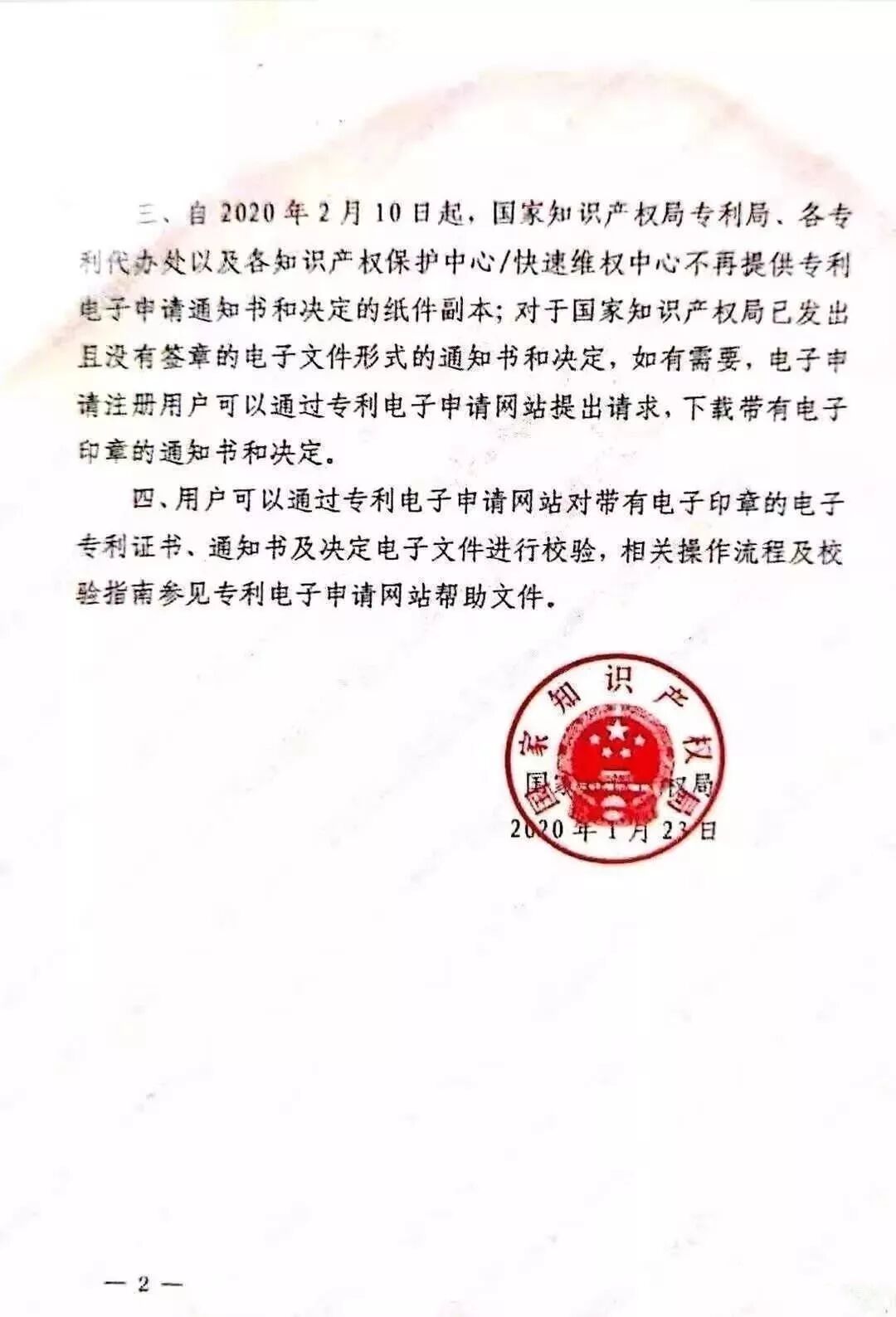 三、自2020年2月10日起,国家知识产权局专利局、各专利代办处以及各知识产权保护中心/快速维权中心不再提供专利电子申请通知书和决定的纸件副本;对于国家知识产权局己发出且没有签章的电子文件形式的通知书和决定,如有需要,电子申请注册用户可以通过专利电子申请网站提出请求,下载带有电子印章的通知书和决定。