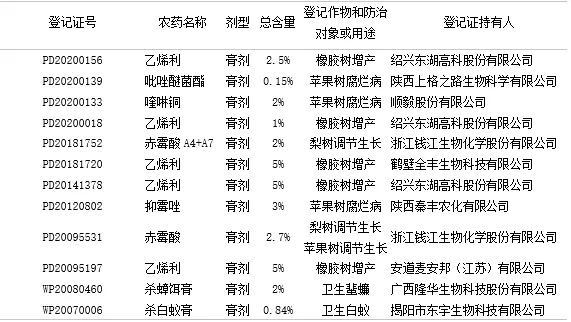 国家标准《农药剂型名称及代码》(GB/T19378—2017,代替GB/T 19378—2003)已自2018年5月1日起正式实施。为与国际接轨,同时因“膏”、“糊”字义相似,“膏”相对严谨,农业农村部农药检定所标准起草人员把原标准中的糊剂改为膏剂(paste,PA),修订了文字说明:膏剂为“含有效成分可成膜的水基膏状制剂,一般可直接使用”。原标准中的浓胶(膏)剂(gel or paste concen-trate,PC)因无登记产品,国际上已取消,故同时取消。截至2020年3月底,我国批准登记并在有效状态的膏剂产品(共12个)具体登记信息如下: