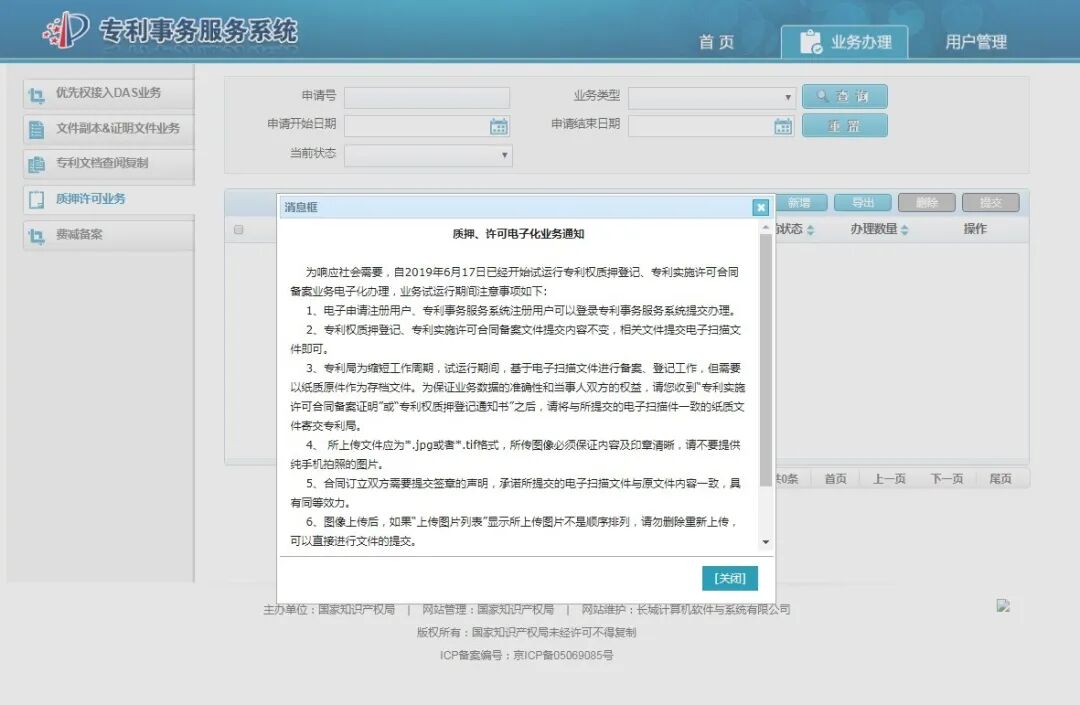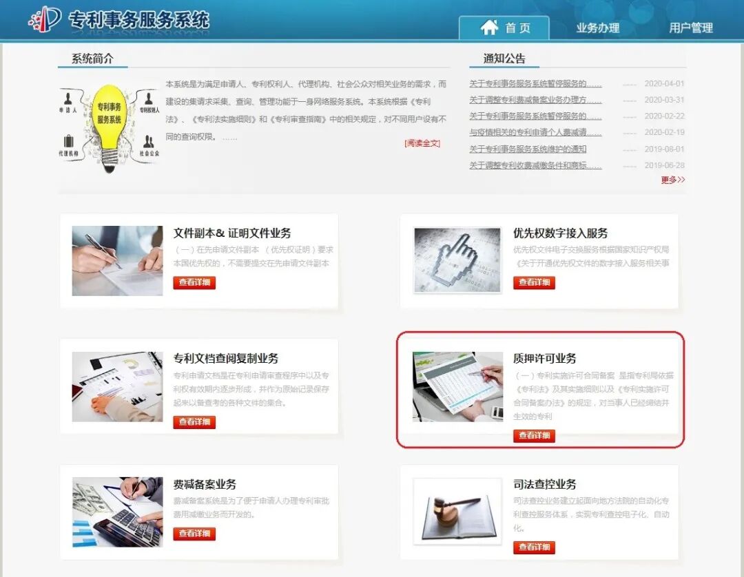 进入系统后,在“首页”选择“质押许可业务”点击“查看详细”后,请认真阅读《质押、许可电子化业务通知》。