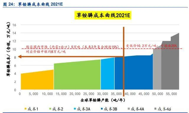 那草铵膦定价多少较为合理?我们认为草铵膦价格中枢由边际产能决定。目前全球约 4 万吨草铵膦需求,我们假设未来两年的复合增速为15%,则2021年全球草铵膦需求量有望达到5.7万吨,国内(内需+出口)有望达到3.7万吨。从成本曲线上可以看出对应草铵膦价格中枢约8万元/吨,对应外购七洲二乙酯的成本(成本3B)。中国是全球最主要的草铵膦生产基 地,2019年产能3.9万吨/年、约生产1.5万吨草铵膦,未来2年内新投放的产能确定性高 的为:七洲络合物 MDP 法二乙酯二期1.5万吨/年产能、以及另一低成本的新工艺广安利尔1万吨/年草铵膦产能(气相法MDP产能1.5万吨/年)。若这两个项目两年内达产,结合MDP: 草铵膦=0.63及二乙酯:草铵膦=0.72的单耗数据,可以推算出利尔和七洲可满足5.1万吨草 铵膦的生产,远大于国内需求市场。所以我们分析认为,成本更高的格氏法产能没有优势、 与行业长期盈利中枢比将处于亏损状态,这部分产能也将逐渐淘汰;而草铵膦价格中枢是由边际产能决定的、即外购七洲二乙酯企业微赚的合理价格,约9-10万元/吨。这个价格比上文中我们通过分析每亩成本得出的12万元/吨的价格更低,草铵膦相对其他非选择性除草剂的性价比将会更加凸显,需求有望增长超预期。
