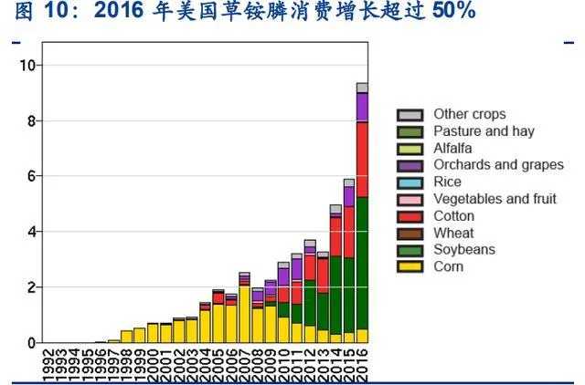 2017 年加拿大LibertyLink与Roundup Ready的比重呈现50:45的关系,我们假设这一比 重至今维持不变(考虑到耐草甘膦杂草比例的提升,这一估计是偏保守的),同时假设加拿大整体转基因油菜渗透率维持95%左右的水平。由此我们可以得出以下结论:第一:从种植面积的成长性来看,我们认为加拿大油菜种植面积呈现周期性波动,继续大幅度提升种植面积的空间有限。根据加拿大油菜委员会公布的2025年规划,该国计划到2025年国内实现油菜籽产量2600万吨,油菜单产提升到52bu/ac,折合种植面积800万公顷, 也基本与目前的种植面积体量持平。第二:从 LibertyLink系统的渗透率角度来看,2010-2017的八年间,渗透率从 45%提高至50%,转基因渗透率已近成熟,我们认为该系统在未来占有率进一步提升空间较小。由此我们认为,作为全球草铵膦消费最大的存量市场——转基因油菜,已呈现出极为明显的 周期性特征,种植面积大幅提升的概率较低、且存在周期性回调的风险。以巴斯夫、科迪华、孟山都公司推广的耐草铵膦转基因大豆、棉花等种子或将成为草铵膦需 求新的增长点。这类产品本质是草甘膦耐受杂草问题加重,科学家采用杂草交替控制的策略, 开发兼具多种除草剂抗性的转基因作物,所以草铵膦与草甘膦需求高度相关。这块的需求增量一直被市场普遍的研究所忽视,之前市场的一致研究预期普遍认为草铵膦的新增量主要在 于百草枯的替代。但是由 USGS 2016 年最新数据显示,美国大豆、棉花等转基因渗透率高 的作物对于草铵膦消费比例显著提升,总消费量增长超过 50%达 920 万磅左右,也在一定程 度上对这一猜测给予验证。以下,我们将通过新闻和数据的搜集整理,解释2014-2016年草 铵膦在大豆、棉花用量变化的原因,同时锁定相关种子的商品名,并对未来推广进行展望。