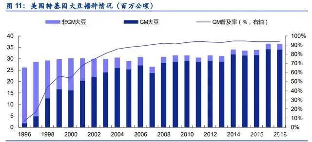 首先,2014-2016年草铵膦在美国转基因大豆中的消费绝对量逐年提升,结合美国转基因大豆播种面积的变况,我们可以推算出具有耐草铵膦性状的大豆渗透况 5%/5%/11%,可见当时抗草铵膦大豆的推广较为顺利。