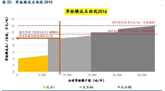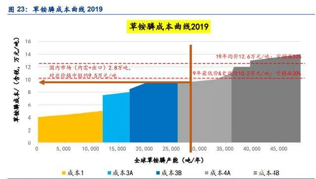 2.3. 性价比提高利于快速放量,草铵膦有望成为下一个10万吨级大单品国内草铵膦的产能扩张与其他周期品种在成长期的发展轨迹类似,也是经历了“需求旺盛——价格上涨——较高盈利回报——大幅扩产”这一循环过程。金融危机后,农化行业景气度上升,由于百草枯全球禁用范围扩大、抗草甘膦超级杂草出现、以及抗草铵膦转基因油菜的推广,草铵膦需求急速膨胀,严重供不应求,原药和制剂(拜耳〃Basta、永农〃百速顿、 威远〃法姆乐)全面缺货,价格也水涨船高。2010年,拜耳为满足市场旺盛的需求,历时2年花费1500万美元完成对位于美国密歇根州Muskegon工厂的扩产,产能增至2000吨/年。此后,威远的低价草铵膦制剂产品紫电青霜进入市场后,又一次刺激了市场需求的快速增长, 国内开始有更多的企业参与进来。2012年以来,国内草铵膦产能扩大了70倍,其中2015-2018年是国内产能扩张最快的两年,例如2015-2017年绵阳利尔大幅度扩产、 2018-2019年永农、七洲、威远、红太阳等新产能投产;海外方面,拜耳 2015年优化其草 铵膦合成工艺、2018年中又新投产6000吨产能至1.2 万吨/年。跌价并不代表行业景气周期向下。2014年前,草铵膦价格高企是限制其使用的最主要原因, 当时草铵膦单吨价格超过30万元,对应亩成本约20元,而同期的其他非选择性除草剂百草和草甘膦成本仅在3-5元/亩,这也就造成了农民对草铵膦的抵触心理。在产能扩张以及工 艺突破双重作用下,草铵膦价格趋势下行,2015-2016年比较明显、从31万元/吨连续下滑至11.7万元/吨,2018-2019年也从20万元/吨下滑至10.2万元/吨(史低价)。通过近5年的大幅降价,草铵膦的性价比已有明显提升,市场规模从2014年的5.6亿美元提升至2018年的9.2亿美元,年复合增速达到13%,属于高增速农药品种。低价凸显性价比、促进新需求爆发,行业需求端可能会走上类似于消费电子的逻辑。从未来草铵膦产能扩张情况来看,增速高于行业需求增速、且工艺成本具有竞争力,草铵膦价格可能趋势下行。但我们认为,价格下调可继续提升其性价比(性价比的比较参见 1.4.中的讨论), 有利于行业推广,抢占其他非选择性除草剂的市场份额,草铵膦有望成为下一个10万吨级 大单品。2.4. 新一轮产能周期大幕拉开,中枢价格下移,低成本是核心竞争力行业成本逐渐下移,企业成本差距及竞争力分化程度加大。高盈利及需求旺盛驱动行业供给端继续扩张,自2018年下半年起,国内草铵膦迎来新一轮产能周期。这轮扩产与 2015 年时期的扩产情况不同,并非只是规模上的扩大,而是伴随着国内企业生产工艺的优化和突破,草铵膦行业成本下移,我们以工艺进步为时间区间划分节点,测算并预测了2016、2019、 2021E年草铵膦行业的平均成本,分别为10.3/9.1/7.7万元/吨。虽然技术的进步确实降低了 行业平均成本,但由于不管是气相法 MDP 还是络合物法MDP、均较传统格氏法壁垒更高, 所以除了利尔和七洲外,行业中其他企业难以在短期内突破,具备不同生产技术的企业的竞 争力分化程度将会扩大,这一点反应在成本曲线上就是陡峭度的增加。在合理价格时,先进工艺产能具有较高盈利能力。上文2.2.中,我们尝试测算出 2021E 草铵 膦合理价格约9-10万元/吨,这个是对应未来两年行业复合增速达到 15%的价格,届时,利 尔气相法MDP工艺生产的草铵膦单吨利润可达1.5-2万元。若我们悲观假设2021年与2019年草铵膦市场需求不变,则可测算出草铵膦合理价格区间在8.5-9万元/吨,而利尔气相法 MDP 工艺生产的草铵膦单吨利润仍可达1-1.5万元,较其格氏法工艺在合理价格(2016 年为11.8万元/吨)时的单吨利润500元有了明显的提升。