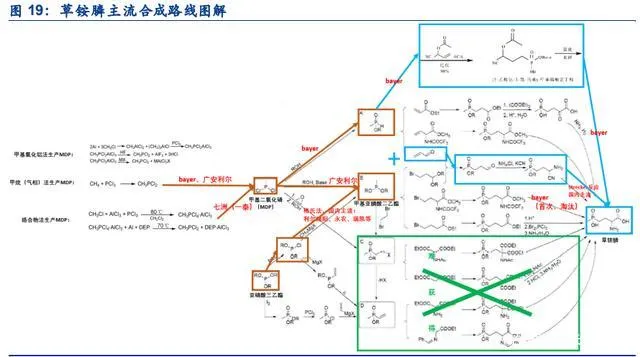 (1) 根据起始原料的不同,合成关键膦中间体 A/B/C/D 可分为两种路线,国内多通过亚磷酸三乙酯经格氏反应生产中间体B(甲基亚膦酸二乙酯),该反应路线步骤多、反应条件苛刻(无水)、存在较大环保和安全风险,技术壁垒相对不高,主要代表企业包括绵阳利尔、永农等。而另一类更为先进的工艺是通过MDP实现的,该方法原子经济性高、三废少,难点在MDP的合成,代表企业有拜耳、广安利尔、七洲及亿盛等。MDP 的成功合成是我国草铵膦生产实现工艺突破的关键一步。(2)关键膦中间体到草铵膦的工业化生产,拜耳通过壁垒较高的 Michael 自由基加成反应;而国内普遍采用成熟的 strecker 路线,缺点为使用剧毒的氰化物、环境风险高。2.2. 工艺路线差距大导致草铵膦成本曲线陡峭,草铵膦价格中枢由边际产能决定根据公司公告及现有环评情况,目前草铵膦全球产能为5.4万吨,国内3.9万吨。中国作为 全球最大的草铵膦生产基地,预计未来将新增1-3万吨产能(包括广安利尔、威远、福华、 长青等),增幅达到26%-79%。分工艺来看,国内格氏法产能最大、占比约 69%,而新技术产能的投放发生于近两年。技术突破的标志性事件一:七洲实现络合物法MDP合成,投产低成本甲基亚膦酸二乙酯格氏法瓶颈为三乙酯,七洲二乙酯投产助推行业成本下行。3年前,国内主流草铵膦生产工艺为格氏法,成本约12万元/吨,亚磷酸三乙酯是绕不开的中间体。2017年下半年起,国内 环保督察严格,亚磷酸三乙酯企业供应受限,这很大程度上影响了草铵膦企业的生产负荷。2018年,七洲5000吨甲基亚膦酸二乙酯(亚磷酸三乙酯的下游产品)投产,这无疑对国内草铵膦企业的生产以及成本降低起到了很大推动作用。从草铵膦价格和除草剂指数的对比也可以看出,2018年下半年起两者出现了背离,草铵膦价格下行是成本端推动的。根据我们对生产成本的测算,络合物MDP法二乙酯生产的草铵膦成本可较格氏法生产成本单吨降低约1-2万元。七洲尚有1.5万吨络合物MDP法二乙酯未投产,产能投放后,二乙酯的供应有望在国内普及,行业平均成本有望进一步下行。