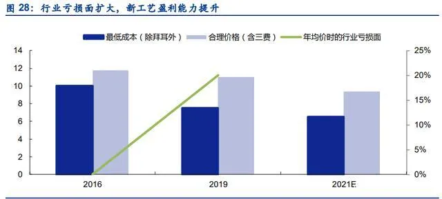 工艺技术进步增大草铵膦成本曲线陡峭程度。通过对项目环评的成本进行拆分,可以估算出:成本1(4-5万元/吨)<成本2(6-7万元/吨)<成本3A(7-7.5万元/吨)<成本3B(8.5-9.5万元/吨)<成本4A(9.5-11万元/吨)<成本4B(11-14万元/吨)。然后,我们以工艺进步为时间区间划分节点,绘制了2016年和2019年草铵膦行业成本曲线。从图中可以看出,技术未实现突破的2016年,格氏法产能为主、占比约78%,即使我们根据企业是自产亦或外购三乙酯中间体可以将成本划分为两级(成本4A、成本4B),可是主要产能的成本曲线较为平缓、极差在4万元以内,在全行业都能盈利的情况下,成本优势其实不能很好地体 现出来。此后,在七洲已实现络合物法MDP合成二乙酯的2019年,较高成本的格氏法产能占比降至46%、新工艺(成本2A、成本2B)产能占比突然增至28%,成本差异增至7万元,行业成本曲线陡峭程度加剧,在行业成本中枢下移、盈利能力下滑、亏损面扩大的背景下,企业的成本竞争力差距开始显现。
