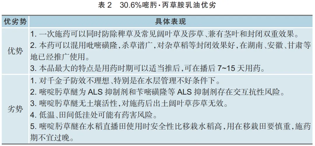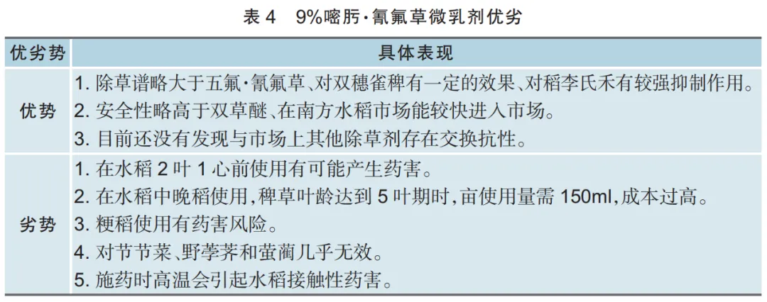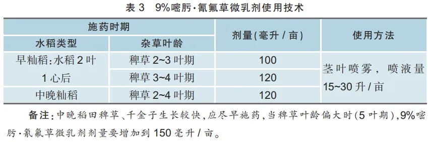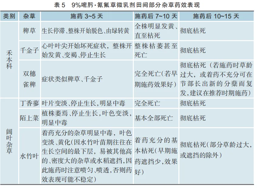 2. 嘧啶肟草醚+氰氟草酯(2∶7):商品名为籼露(9%嘧肟·氰氟草微乳剂),其使用技术见表3,优劣见表4,田间部分杂草药效表现见表5。