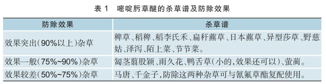 嘧啶肟草醚对水稻移栽田和直播田的稗草、一年生莎草及阔叶杂草有较好的防除效果,可以防除稗草、野慈姑、雨久花、谷精草、母草、狼把草、萤蔺、日本藨草、眼子菜、四叶萍、鸭舌草、节节菜、泽泻、牛毛毡、异型莎草、水莎草、千金子等,详见表1。