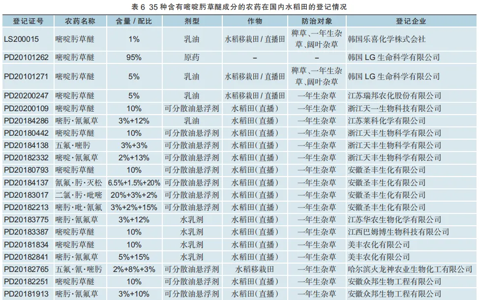 该除草剂品种于1996-1997年间上市,防治谱广泛,活性佳,持效期长,对哺乳动物、作物、环境安全,市场前景较为广阔,已经逐步引起了国内企业的关注,但目前国内获得登记的企业还不多。目前在国内主要由韩国LG生物科技有限公司、瑞士先正达作物保护有限公司、江苏省苏州富美实植物保护剂有限公司、浙江省杭州宇龙化工有限公司等登记,具体的登记信息可见表6。