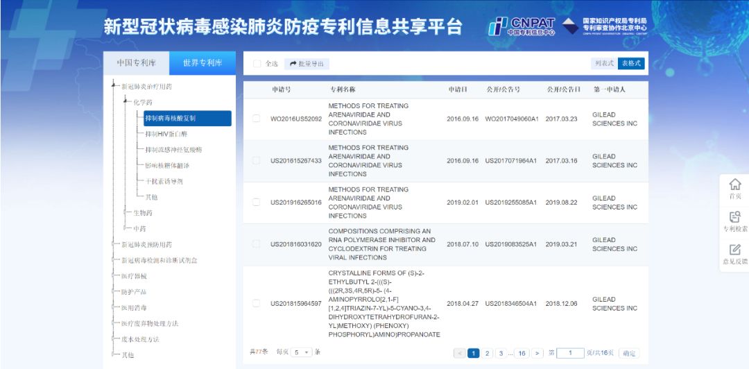 疫情当前,中国专利信息中心紧急开发了疫情相关专利数据库(地址http://fy.patentstar.com.cn),由资深专利审查员依据78个技术分支筛选出近万篇中文和外文专利文献,并按照技术相关度进行排序。