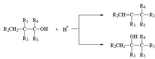 当醇羟基的b-碳原子是个仲碳原子(二级碳原子)或叔碳原子(三级碳原子)时,在酸催化脱水反应中,常常会发生重排反应,得到重排产物: