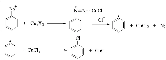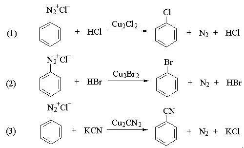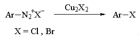 重氮盐用氯化亚铜或溴化亚铜处理,得到氯代或溴代芳烃: