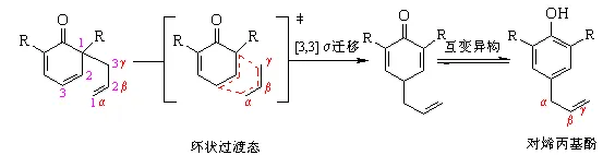 从烯丙基芳基醚重排为邻烯丙基酚经过一次[3,3]s迁移和一次由酮式到烯醇式的互变异构;两个邻位都被取代基占据的烯丙基芳基酚重排时先经过一次[3,3]s 迁移到邻位(Claisen 重排),由于邻位已被取代基占据,无法发生互变异构,接着又发生一次[3,3]s 迁移(Cope重排)到对位,然后经互变异构得到对位烯丙基酚。