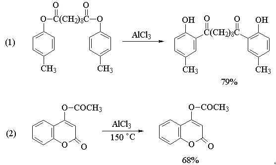 酚酯在Lewis酸存在下加热,可发生酰基重排反应,生成邻羟基和对羟基芳酮的混合物。重排可以在硝基苯、硝基甲烷等溶剂中进行,也可以不用溶剂直接加热进行。