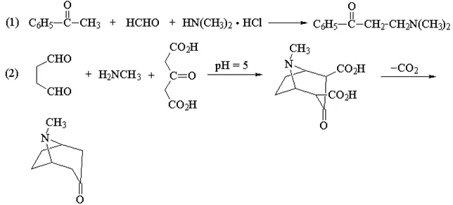 含有a-活泼氢的醛、酮与甲醛及胺(伯胺、仲胺或氨)反应,结果一个a-活泼氢被胺甲基取代,此反应又称为胺甲基化反应,所得产物称为Mannich碱。