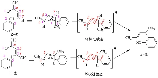 取代的烯丙基芳基醚重排时,无论原来的烯丙基双键是Z-构型还是E-构型,重排后的新双键的构型都是E-型(反式),这是因为重排反应所经过的六员环状过渡态具有稳定椅式构象的缘故。