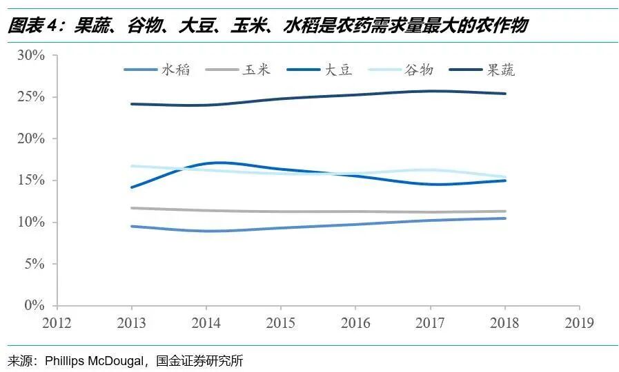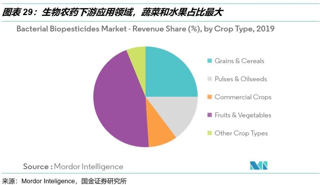 目前水果和蔬菜是生物农药主要应用领域。这是由于生物农药的成本较高,蔬菜和水果等经济作物对生物农药成本相对不敏感。