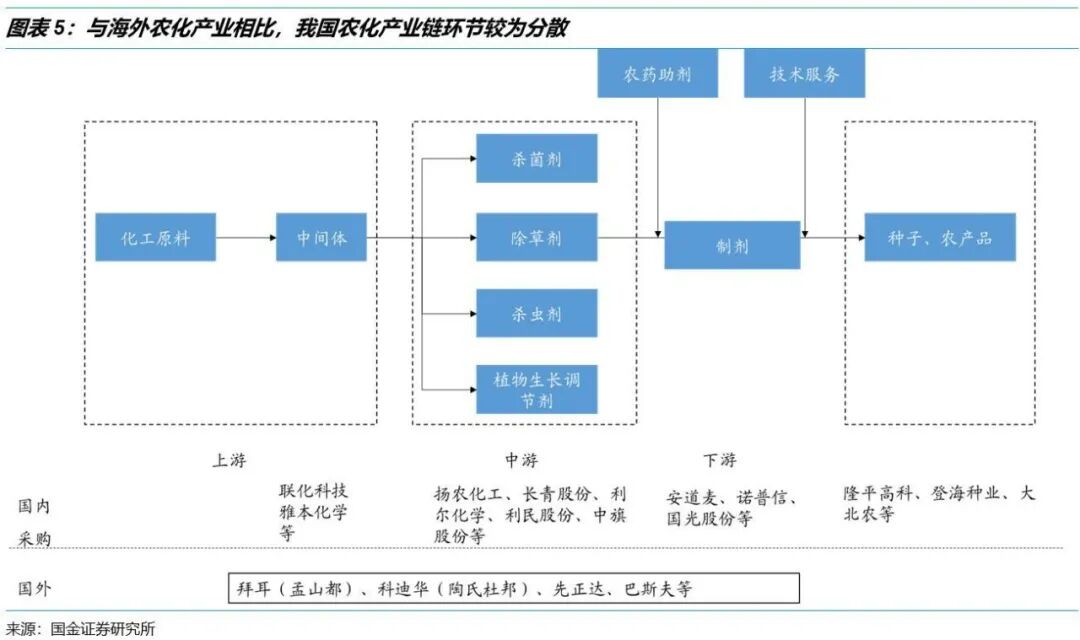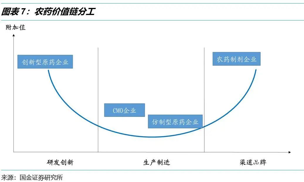 从农药产业链环节看,跨国公司把控前端研发和终端渠道,中国企业处于加工制造环节。农药分为创新药、仿制药、中间体、制剂,从全球范围内来看,价值链最高的两端是创新药和制剂,国际农化巨头把控前端创新药的研发和终端的制剂销售渠道,并且将农药、种子、化肥等捆绑销售,实现一体化商业模式,仿制药原药和中间体环节更多选择从中国、印度等国家来采购。中国农药企业主要集中于仿制药的生产和中间体的定制化加工,终端制剂市场呈现分散格局。