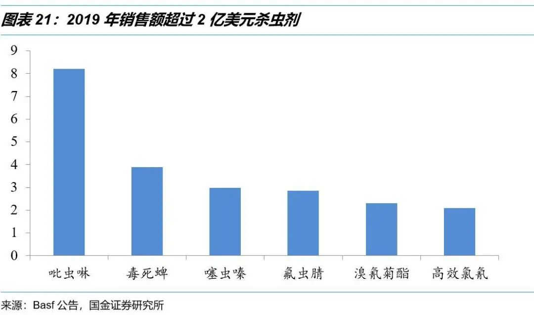 目前杀虫剂目前主要产品包括新烟碱类、拟除虫菊酯类、有机磷类、氨基甲酸酯类、天然物类杀虫剂。其中新烟碱类、拟除虫菊酯类、有机磷类三大杀虫剂销售额占比总和超过50%。