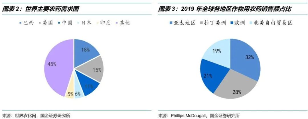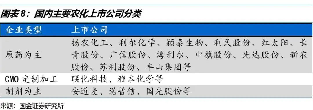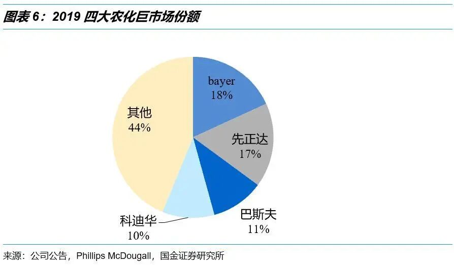 海外农化巨头把控前端研发和终端销售渠道。目前,农药新产品的开发主要集中在资本较为雄厚能够承担昂贵的开发费用和开发损失的国际农化巨头。从终端制剂市场来看,四大农化巨头(先正达、拜尔、科迪华、巴斯夫)占据全球超过50%的市场份额,海外农化巨头把控终端制剂渠道,原药环节选择采购的形式。