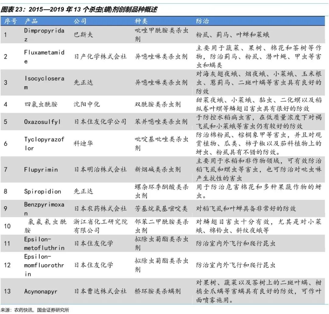 此外,具有新颖结构的杀虫剂亦受跨国公司青睐,杀虫剂acynonapyr、dimpropyridaz和isocycloseram结构新颖,并可能具有新的作用位点和作用机制,具有巨大的市场发展潜力。