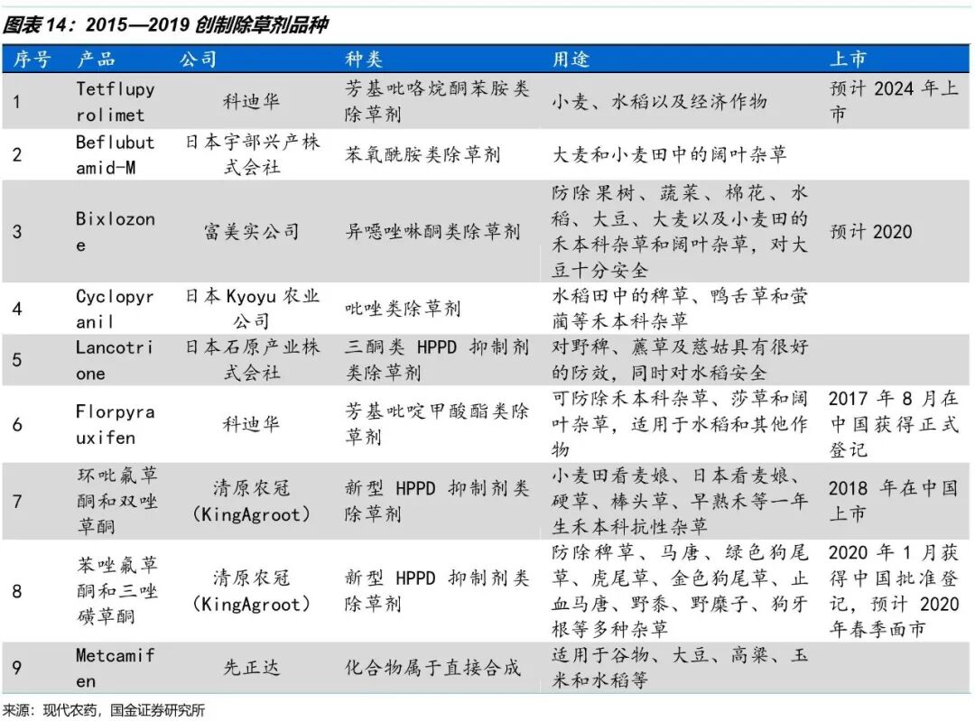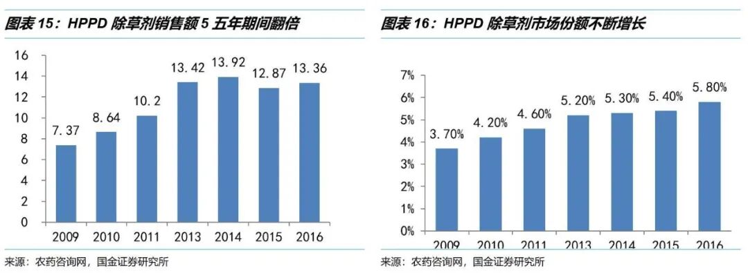 从创制药品种来看,2015-2019年公开了10个除草剂和1个除草安全剂,其中HPPD类除草剂5个,吡啶羧酸类、吡唑类、异噁唑啉酮类、苯氧酰胺类和吡咯烷酮类除草剂各1个,磺酰胺类除草安全剂1个。从创制品种来看,HPPD抑制剂类除草剂,成为各大公司重点推出的除草剂品种。HPPD抑制类除草剂由于其活性高、杀草谱广、抗性风险低,2009年以来成为除草剂市场增长最快的产品类型之一。其销售额从2009年的7.37亿美元增至2016年的13.36亿美元,7年来市场接近翻番,2009-2016年的复合年增长率为8.9%。