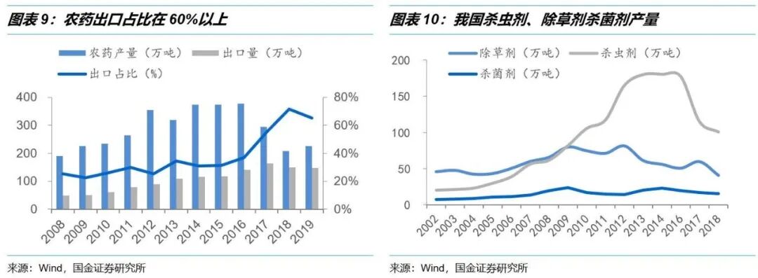 我国农药行业起步较晚,但发展迅速,产量从1983年的33万吨上升至2014-2016年的370万吨以上,成为全球第一大农药生产国。我国原药产量位于世界第一,原药出口比例在60%以上。