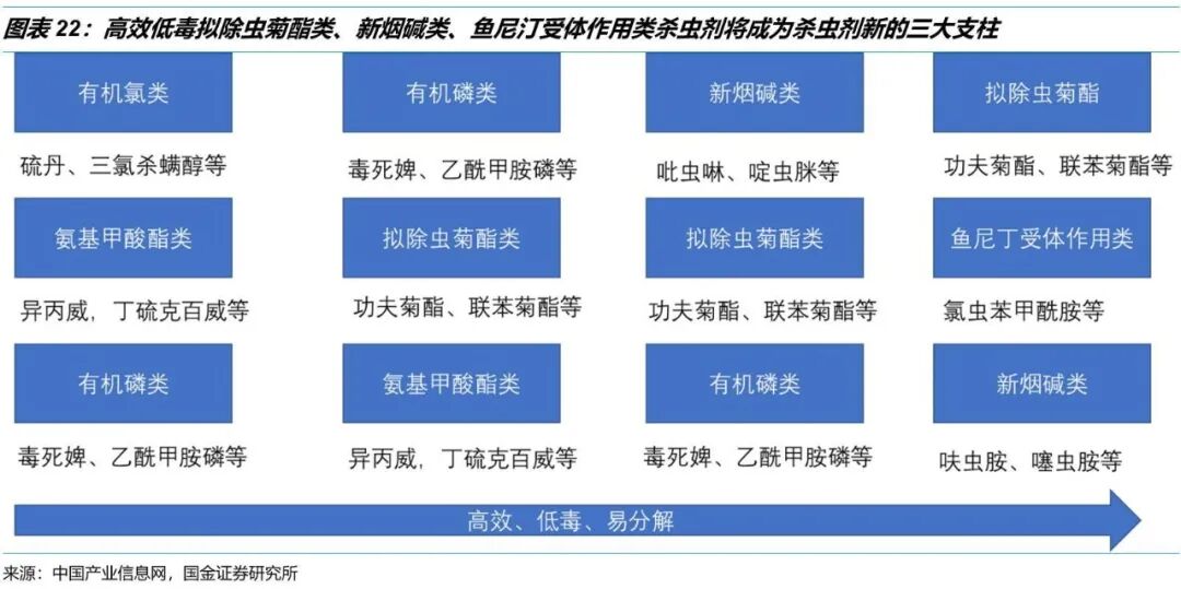 自杀虫剂上市以来,有机氯类、氨基甲酸酯类、有机磷类是杀虫剂最早的三大支柱;上世纪40年代,由于有机氯类杀虫剂的高残留性逐渐被禁用淘汰;上世纪70年代开始有机磷类、氨基甲酸酯类、拟除虫菊酯类杀虫剂成为新的杀虫剂三大支柱;上世纪90年代之后,氨基甲酸酯类和有机磷类杀虫剂由于其高毒性,逐渐被新烟碱类杀虫剂所取代。目前有机磷类杀虫剂的份额在不断萎缩之中,被高效低毒的新型杀虫剂取代是大势所趋。近年来新颖的鱼尼汀受体作用类杀虫剂氯虫苯甲酰胺等迅速崛起,未来拟除虫菊酯类、新烟碱类、鱼尼汀受体作用类杀虫剂将成为杀虫剂新的三大支柱。
