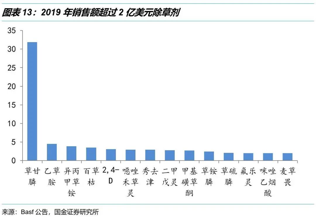 按作用方式区分,除草剂分为非选择性除草剂和选择性除草剂两种。非选择性除草剂对植物不分良莠,代表品种有草甘膦、草铵膦、百草枯等。选择性除草剂通过施药部位、时间、作物和杂草的形态特征及生物化学反应等实现定向除草,其中生化作用是实现选择性的主要原因,代表品种主要有麦草畏、莠去津、2,4-D 酯等。除草剂细分产品TOP15占除草剂总销售额的51%。