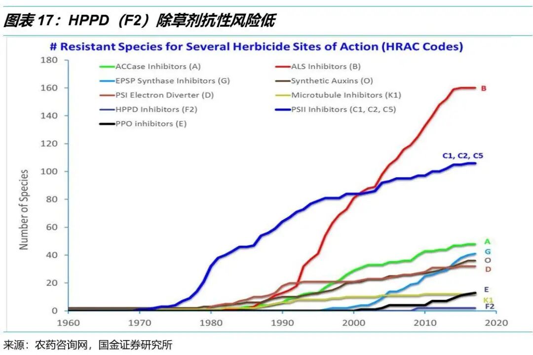伴随着农业生产方式的持续变革、转基因抗除草剂作物种植增长、环境规划与林地杂草治理的需求,除草剂的应用还将持续增长。同时随着以草甘膦为代表的除草剂长时间使用,杂草抗性问题日益突出,解决杂草抗性主要有三种方法:(1)复配实现不同作用机理的除草剂的有机结合(2)利用转基因技术,针对现有除草剂,开发抗除草剂种子(3)创制新型除草剂,但是难度较大。