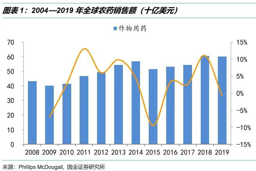 全球农药在2008年销售额是423亿美元,到2018年增长至604.5亿美元,年复合增速为3.6%。根据Phillips McDougall数据,2019年全球作物用农药销售额为598.27亿美元,同比下降0.8%;非作物用农药的销售额为78.02亿美元,同比增长3.5%;两者合计总销售额达到676.29亿美元,同比下降0.31%。2019年全球农化市场之所以出现小幅下滑,主要原因是:(1)北美经历了严重的洪灾以及中美贸易战(2)欧洲除了出现异常的天气情况外,也与监管层对于农药总是采取最严格的监管有关(2019年1月1日起,欧盟将正式禁止含有化学活性物质的320种农药在境内销售)。